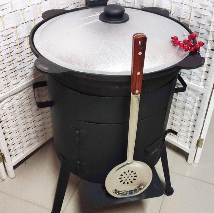 Набор печь для казана усиленная с дымоходом Мастер и казан на 10 литров. В комплекте шумовка и ляган 32 см