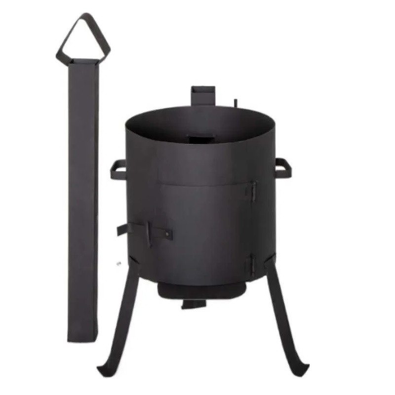 В данной печи в 3-и несъемные, приваренные опоры (ножки), дверца, дымоход, покрытии печи сделано из термостойкой эмали, качество обработки на высочайшем уровне. Вы не найдете заусениц, острых, не зашлифованных кромок на данной печи. Ножки обеспечивают великолепную устойчивость. Данная печь идеально подойдет для использования на даче, а благодаря разборному функционалу, поместиться даже в небольшой багажник легкового автомобиля и Вы сможете удивить блюдами в казане гостей не только дома, но и на природе