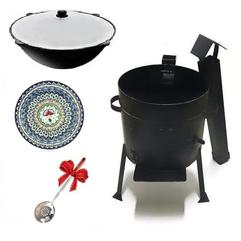 Набор печь для казана усиленная с дымоходом Мастер и казан на 22 литра. В комплекте шумовка и ляган 32 см