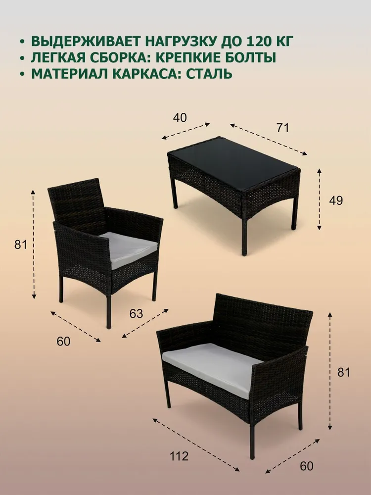 Комплект садовой мебели "Доминика" является идеальным решением для тех, кто ценит комфорт и стиль. Он поможет вам создать уникальное пространство для отдыха, наслаждаться солнечными днями и проводить время с близкими, не беспокоясь о комфорте и эстетике. Элегантный и функциональный, этот набор мебели предложит вам бесконечные возможности для создания незабываемых моментов на открытом воздухе.