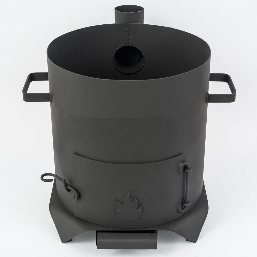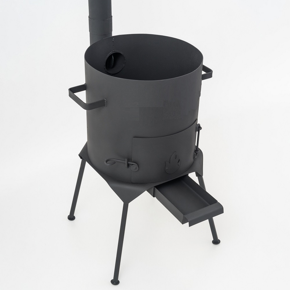 В данной печи 4-ре съемные ножки фиксируемые болтами, дверца, высокий круглый дымоход, зольник. Покрытие печи сделано из термостойкой эмали, качество обработки на высочайшем уровне. Вы не найдете заусениц, острых, не зашлифованных кромок на данной печи. Ножки обеспечивают великолепную устойчивость. Данная печь идеально подойдет для использования на даче, а благодаря разборному функционалу, поместиться даже в небольшой багажник легкового автомобиля и Вы сможете удивить блюдами в казане гостей не только дома, но и на природе.